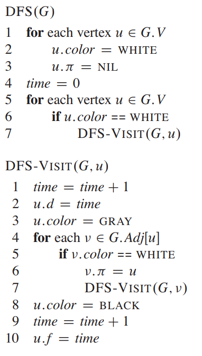 5-7. 한 꼭짓점 u에 대해서 u의 색이 흰색이면 DFS-VISIT(G, v)를 실행한다.