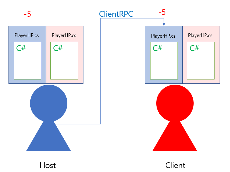그래서, Server RPC를 사용하게 되는데, Server RPC란 Client가 서버에게, "나 파란색 플레이어에게 5의 데미지를 입혔어. 업데이트 해 줄래?" 라고 메세지를 전하는 것이다. 그러면, Host가 파란색 PlayerHP 스크립트에 5의 데미지를 입히기 위해 변수를 조정하는 것이다.
