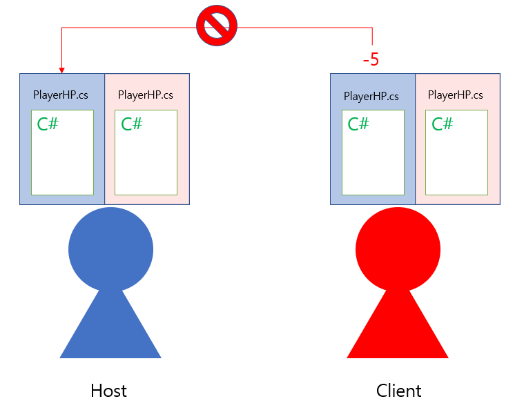 Client인 빨간색 플레이어가 파란색 플레이어 에게 5의 데미지를 입혔을 때, 자신이 가지고 있는 파란색 PlayerHP 스크립트를 변경할 수 없다는 것이다. 그러면, 변경을 할 수 없으니 당연히 서버에게 변수의 변화를 알리는 것 또한 불가능하다. 스크립트의 변수를 변경할 수 있는 것은 오직 Server(Host)만이 가능하다.