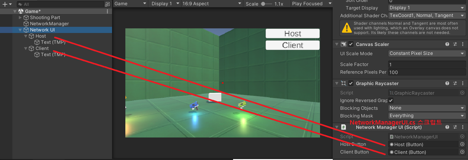 그리고, Network Variable을 조금 내려 보면 3개의 버튼이 존재하는 데, UI 를 만들어 각각의 기능들을 게임 씬 내에서 버튼으로 사용할 수 있도록 해야 한다.